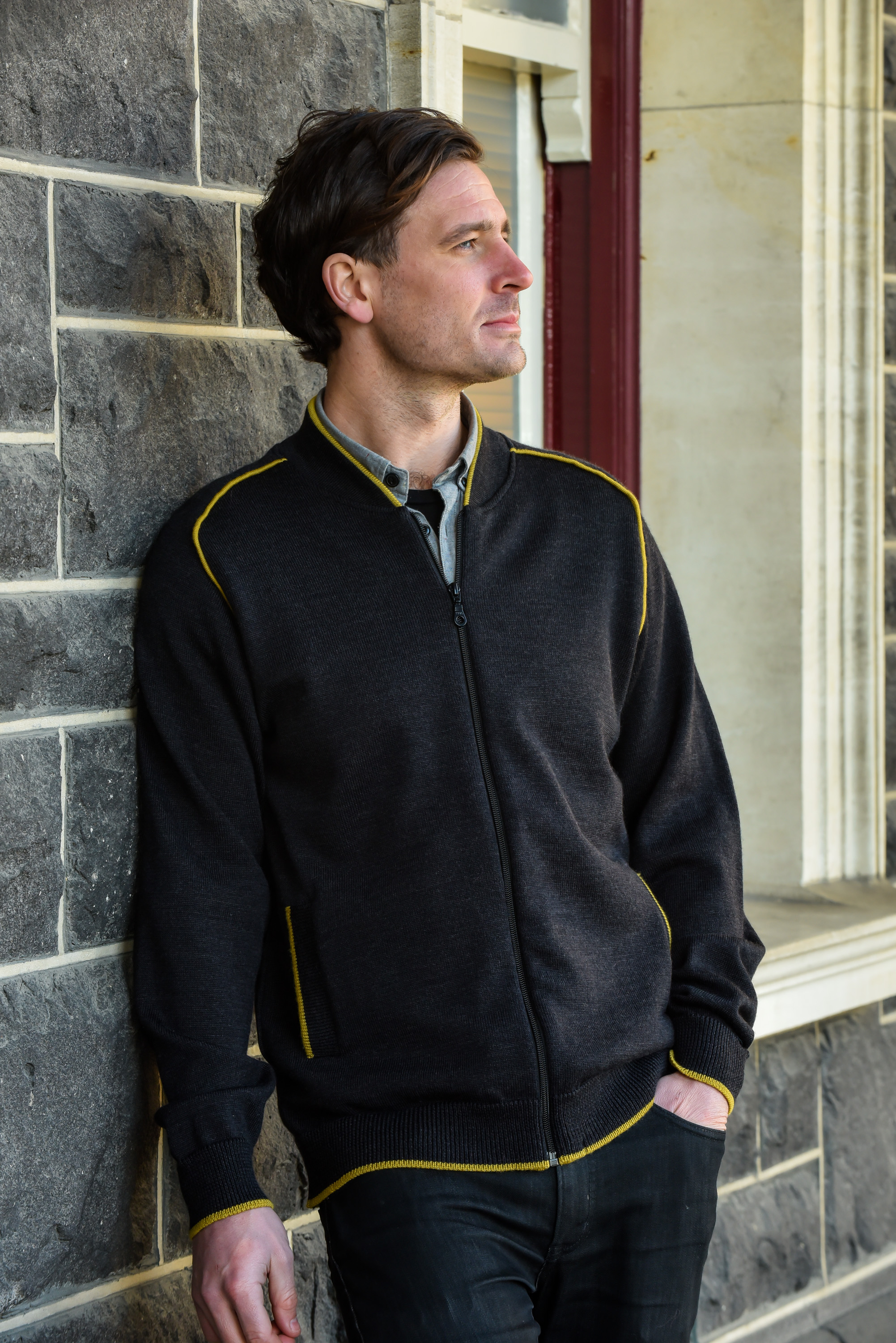 Mid weight merino zip through jacket with contrast piping along shoulder, cuffs, neckline, hem and pockets